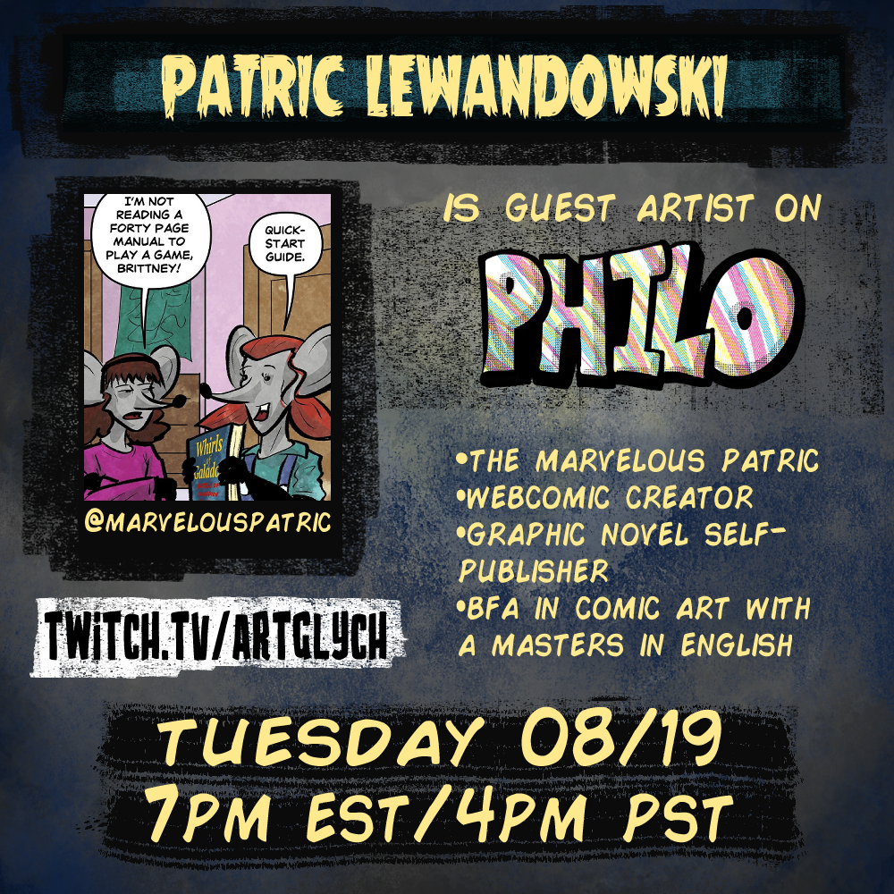 We’re having “Freaks n Squeaks” creator Patric Lewandowski joining us Tuesday for Philo! What hellscape will Philo fall into now!?!? You let us know! We’ll see you either in Twitch or youtube.com/@artglych for the LIVE recording!