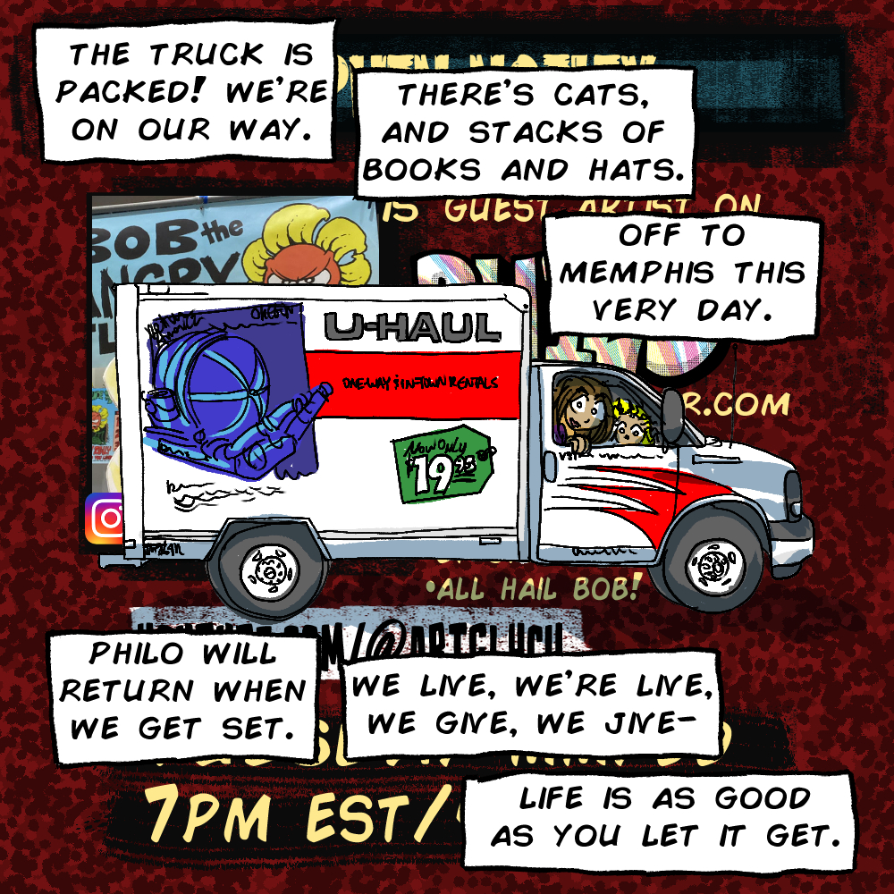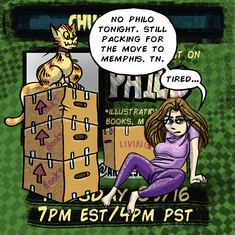 No Philo tonight. Thank you to my artist for being ready, but I had to cancel. Still sore from packing and getting ready to pick up my life.