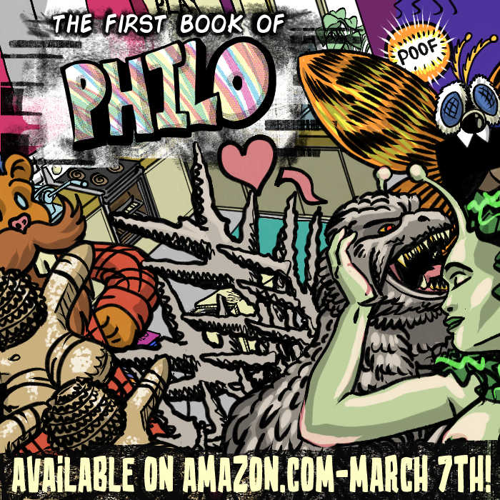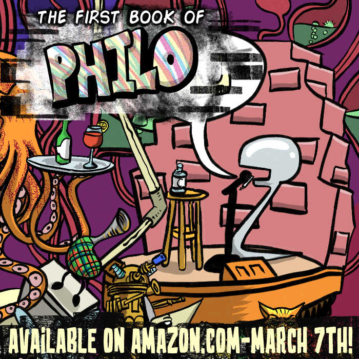 Tomorrow! The First Book of Philo will be available on Amazon! No link, but here’s a teaser of a talking word balloon doing standup in the stomach dimension and Haggis, the Bagpipe.